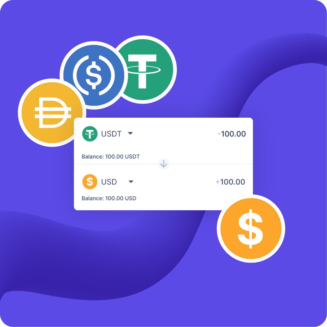 Mitigate crypto price volatility by settling your cryptocurrency transactions into stablecoins in real time.