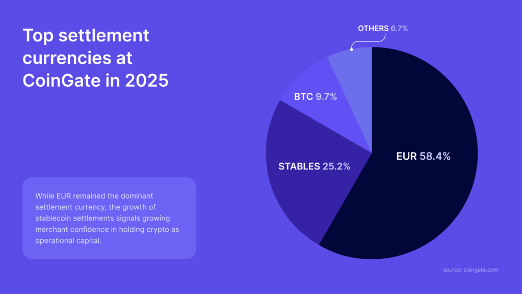 More businesses began accepting crypto payments, often using payment processors that instantly convert crypto to fiat, reducing volatility exposure. At CoinGate, 58.4% of all payments settle into EUR.