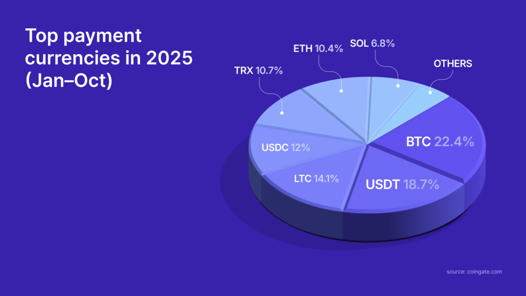 In 2025 (Jan–Oct), SOL ranks as the seventh most popular cryptocurrency on CoinGate, contributing 6.8% of all processed payments. It sits just behind the largest and most established assets on the platform: