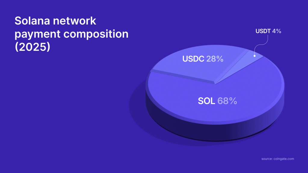 A notable portion of Solana network activity on CoinGate involves USDC, which accounts for 28% of all payments on the Solana blockchain. This reflects a wider industry trend: Solana has become one of the preferred networks for USDC settlement, thanks to its fast performance and cost efficiency.