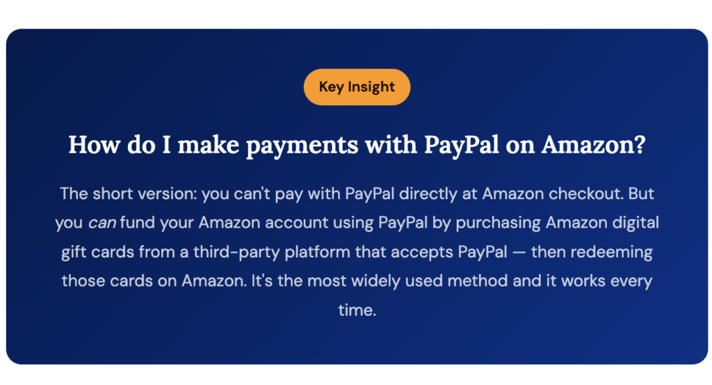 Here’s the simple truth: while checkout isn’t a thing, digital gift cards are. The bridge between your PayPal account and Amazon is the Amazon gift card.