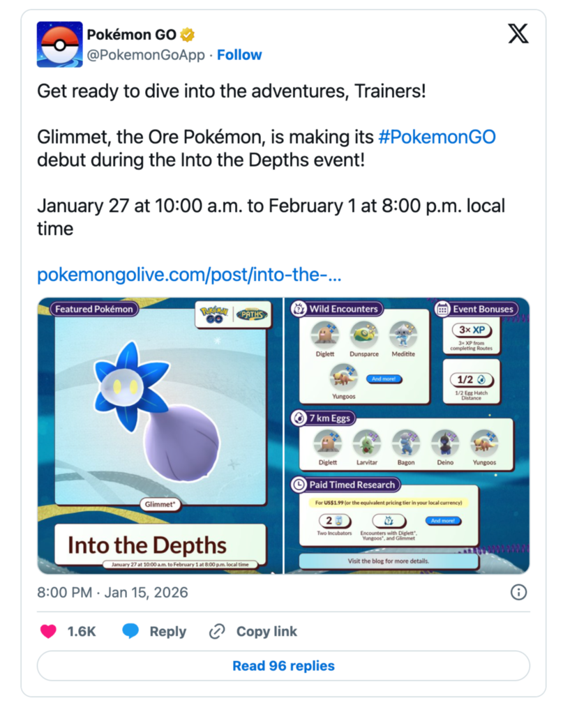 New Pokémon debuts are always a big deal in GO, especially when they’re tied to an event theme. “Into the Depths” sounds like it’s focused on exploration and ocean-style encounters, and Glimmet fits perfectly as a rare, treasure-like discovery.