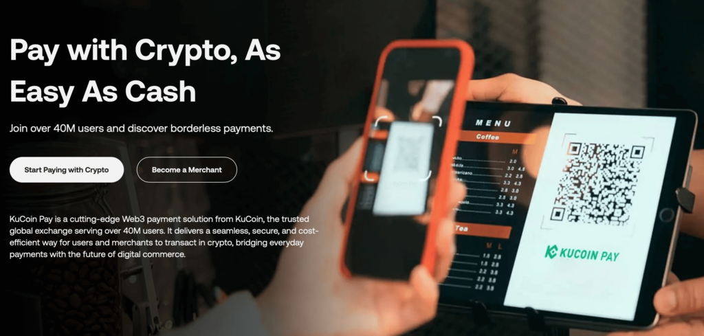 KuCoin Pay is a pioneering merchant solution that drives business growth by integrating cryptocurrency payments into retail. It offers a contactless, secure, and borderless payment system using a variety of cryptocurrencies and stablecoins. KuCoin Pay supports over 50 cryptocurrencies, including KCS, USDT, USDC, and BTC, which users can use to seamlessly pay for global products and services, both online and in-store.