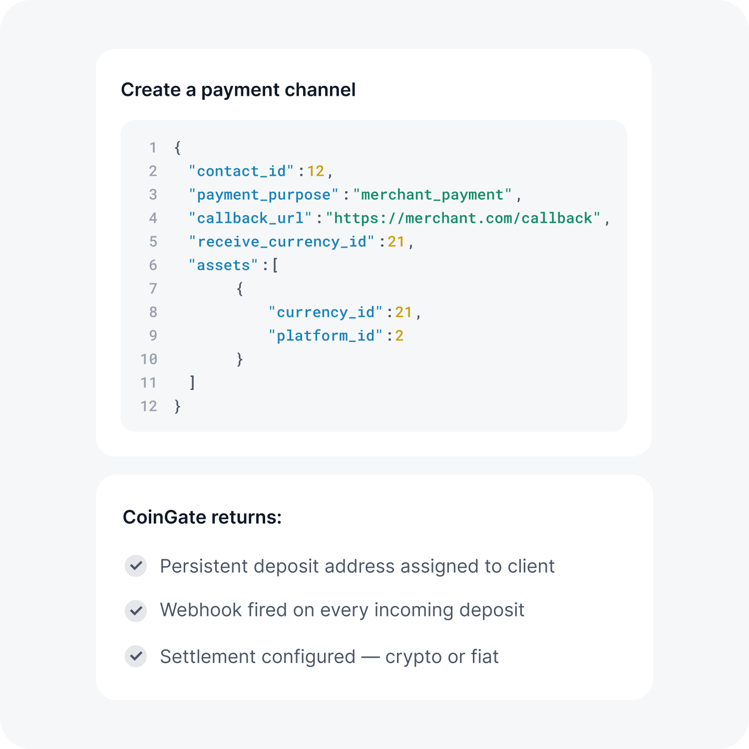 CoinGate payment channels will provide your clients with dedicated crypto deposit addresses they can send assets to at any time. Every deposit is detected, attributed, and settled automatically.
